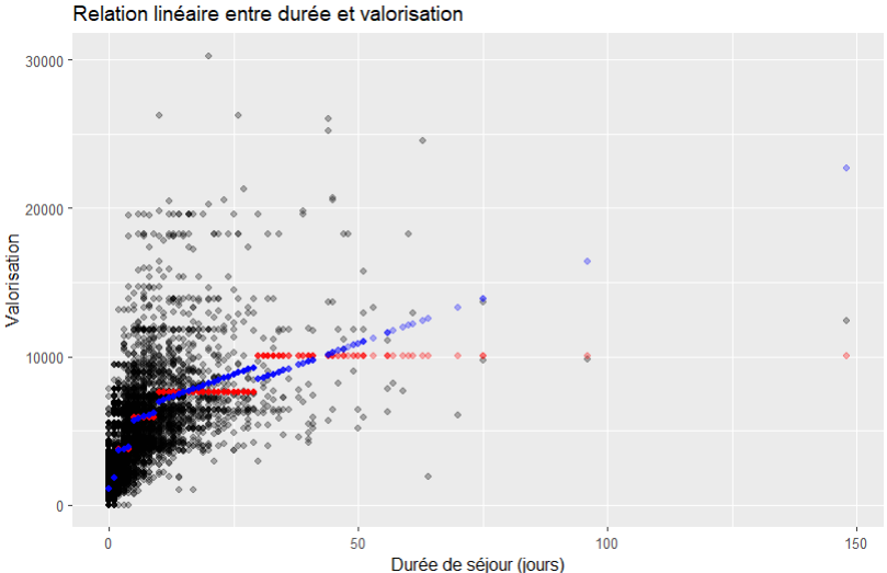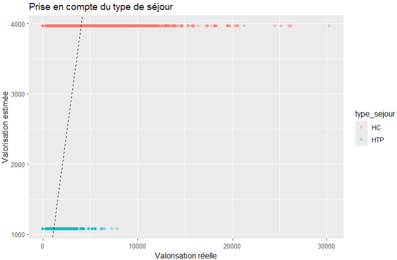 2 100 10 HC [10,30) 7618.RNous obtenons ainsi une colonne supplémentaire dans sejours_du_jour qui a prédit la valorisation en se basant sur l’expérience acquise en traitant sejours. Je vous laisse essayer par exemple en prenant d’un côté votre visualvalo d’un mois M pour l’entrainement et les nouveaux séjours du mois M+1 pour les prédire.