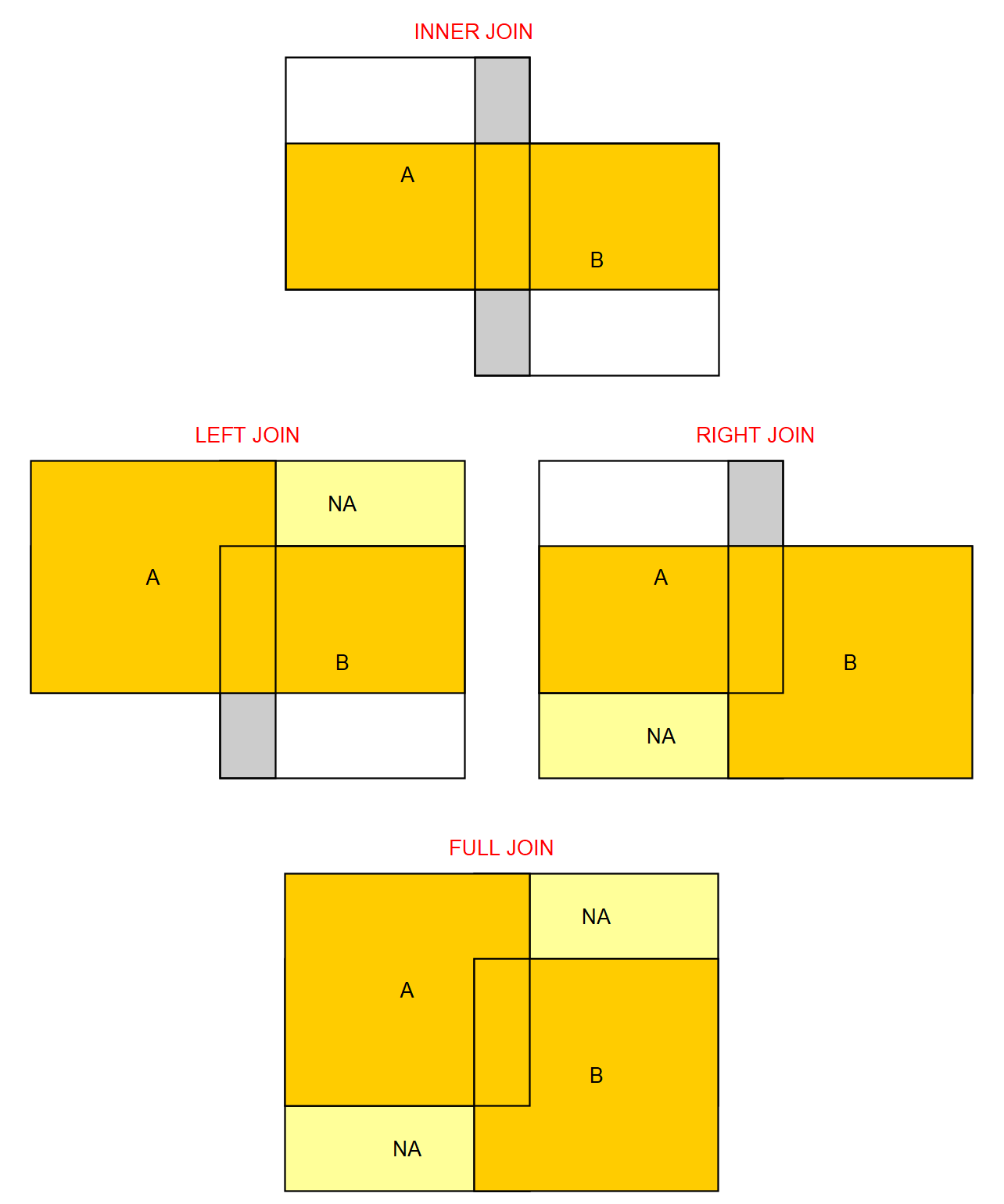 On retrouve exactement le pendant des jointures SQL : inner_join(), left_join(), right_join(), full_join(). Pour rappel voici un schéma des données sélectionnées dans chacun des cas :