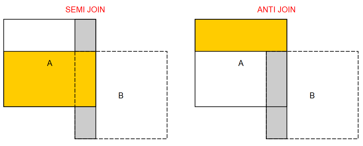 INNER JOIN,LEFT/RIGHT (OUTER) JOIN,FULL JOIN) - les filtering joins (jes jointures de filtre) qui donnent en sortie une sous-sélection de lignes de la table de gauche sans rajouter des nouvelles colonnes. Certains SQBDRs ont ces fonctions ou à défaut il faut utiliser des sous-requêtes avec
